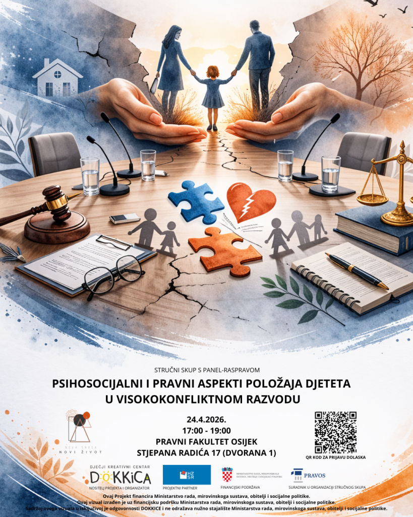 Dječji kreativni centar DOKKICA otvara prijave za stručni skup „Psihosocijalni i pravni aspekti položaja djeteta u visokokonfliktnom razvodu“, koji će se održati 24. travnja 2026. godine od 17 do 19 sati na Pravnom fakultetu u Osijeku (dvorana 1, Stjepana Radića 17).