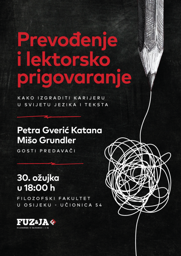 U ponedjeljak 30. ožujka 2026. u sklopu FUZ&JA-e, projekta popularizacije znanosti Filozofskog fakulteta u Osijeku, magistar engleskoga i švedskoga Mišo Grundler i magistra hrvatskoga i poljskoga Petra Gverić Katana iz Zagreba održat će prevoditeljsko-lektorski razgovor o brojnim aktualnim temama iz struke. Predavanje je otvoreno za javnost i održava se u učionici 54 Filozofskog fakulteta (Lorenza Jägera 9) u 18 sati.