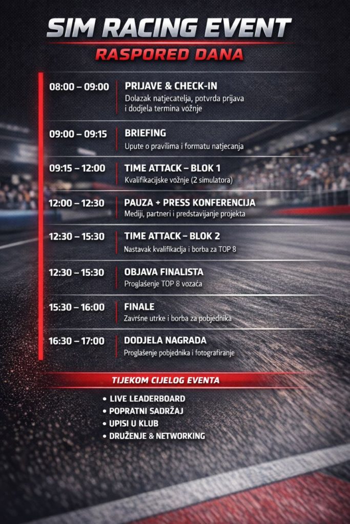 Događaj je namijenjen svim ljubiteljima automobila, vozačima, sim racerima i svima koji žele dobru atmosferu i kvalitetno druženje.