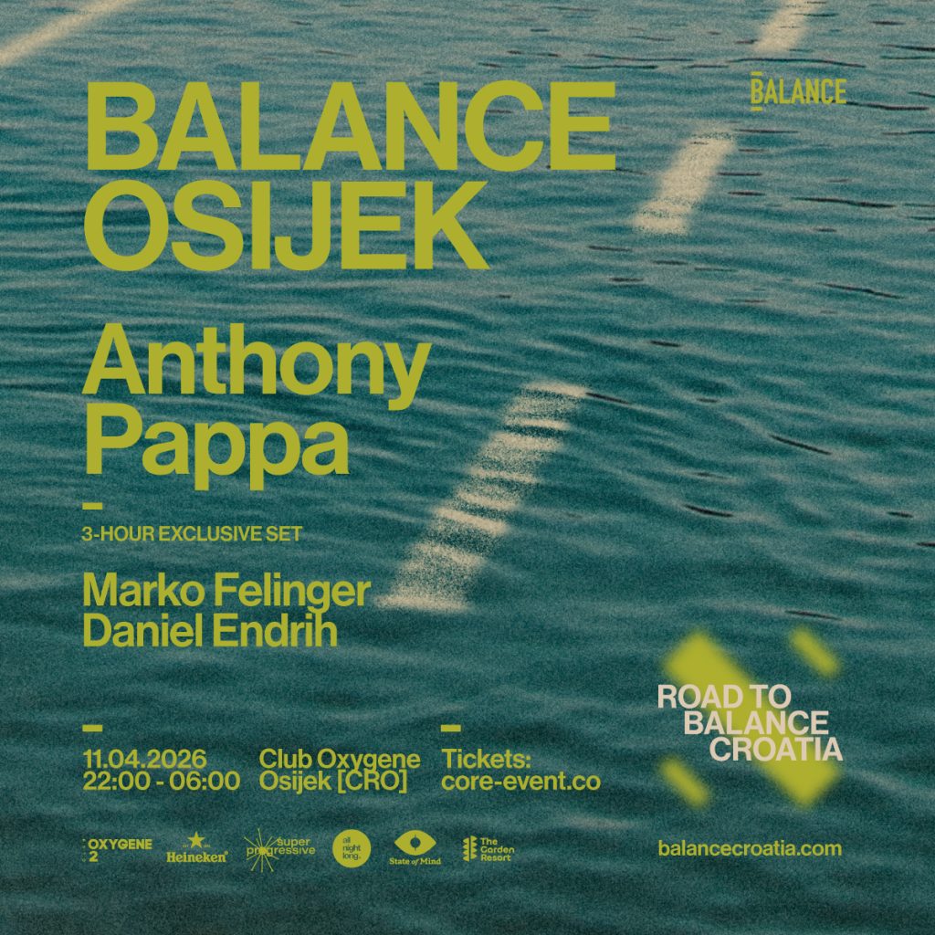 Kako se približava ljeto i drugo izdanje Balance Croatia festivala, serijal evenata Road to Balance donosi festivalsku atmosferu diljem zemlje, a sljedeća postaja je Osijek. U subotu, 11. travnja, klub Oxygene postaje središte progresivnog zvuka uz gostovanje istinske legende elektroničke scene, Anthony Pappa, koji će po prvi put nastupiti u Osijeku. S više od tri desetljeća bogate karijere iza sebe, Pappa slovi kao jedan od najznačajnijih izvoznika australske elektroničke glazbe.