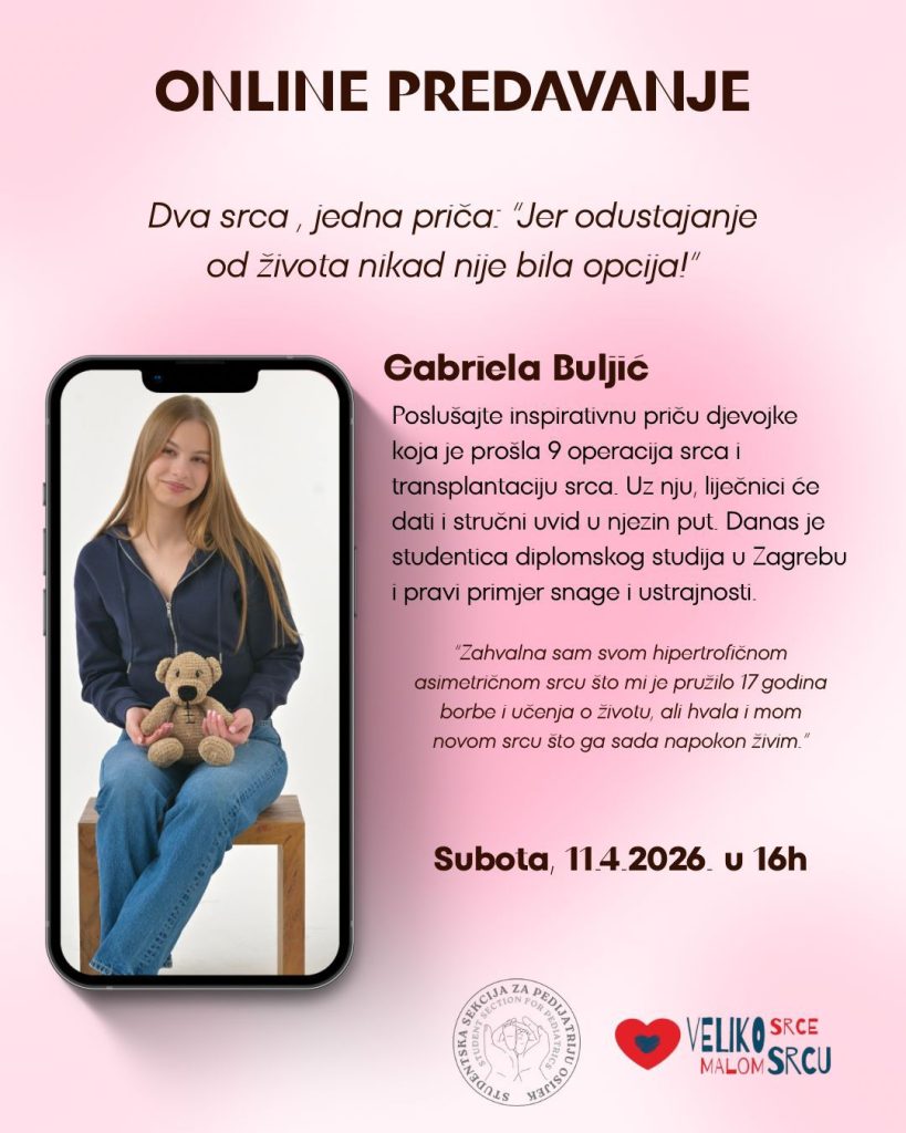 Studentska sekcija za pedijatriju Medicinskog fakulteta u Osijeku organizira predavanje pod nazivom Dva srca, jedna priča: “Jer odustajanje od života nikad nije bila opcija!“ uz udrugu Veliko srce malom srcu.