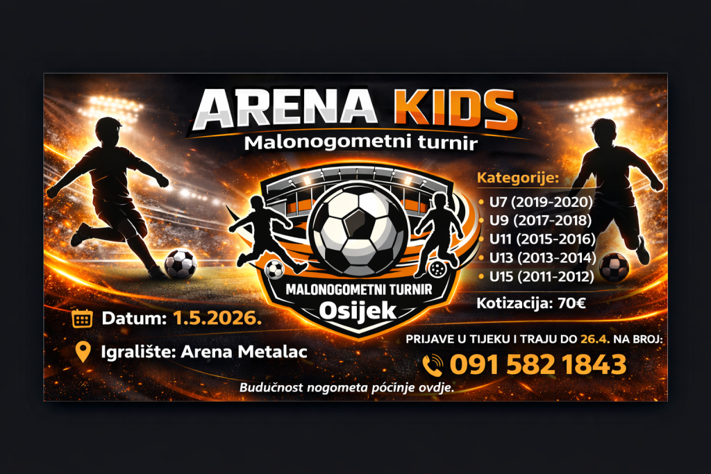 U Osijeku će se1. svibnja održati 11. Arena Kids malonogometni turnir 2026. Turnir je na rasporedu u petak, 1. svibnja 2026. godine, u vremenu od 9 do 19 sati, a igrat će se na igralištu Metalac – Bikara.
