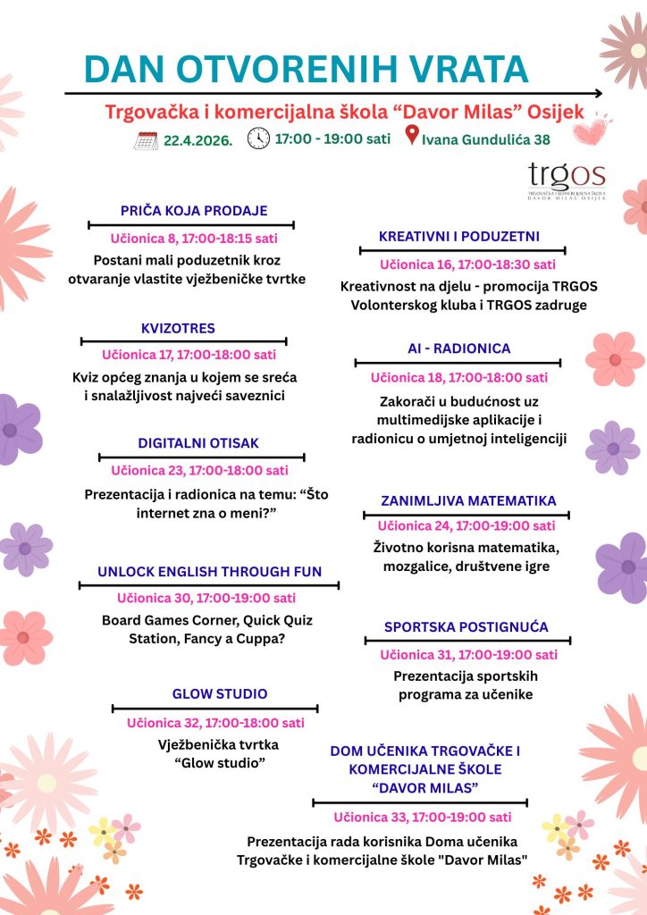 Trgovačka i komercijalna škola “Davor Milas“ Osijek organizira Dan otvorenih vrata koji će se održati u srijedu, 22. travnja 2026. godine, u vremenu od 17 do 19 sati.