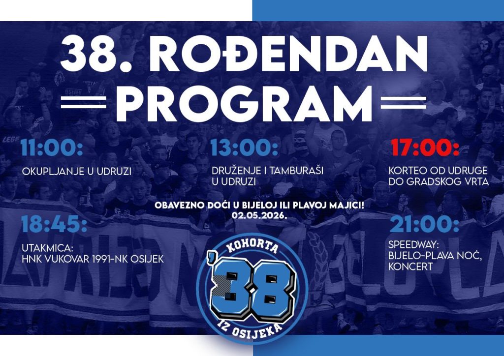 Navijačka skupina Kohorta Osijek objavila je konačan program proslave svog 38. rođendana, koja će se ove godine održati u subotu, 2. svibnja 2026., uz cjelodnevni sadržaj i središnji događaj na utakmici HNK Vukovar i NK Osijek i to na dobrom starom Gradskom vrtu.