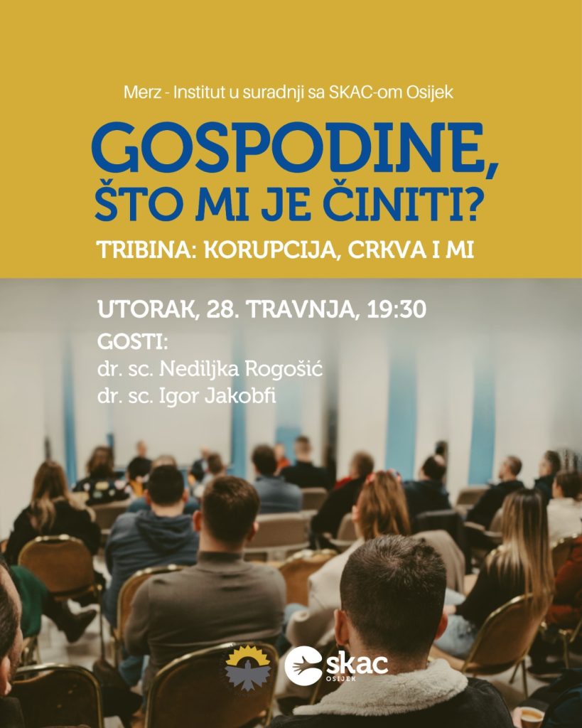 U utorak, 28. travnja s početkom u 19,30 sati, u prostorima Isusovačke rezidencije (ul. kardinala Alojzija Stepinca 27) održat će se tribina pod naslovom “Korupcija, Crkva i mi“. Ovaj susret, koji se odvija neposredno nakon večernje svete mise, dio je ciklusa „Gospodine, što mi je činiti?“, a organizira ga Institut kršćanskog civilnog društva “Ivan Merz“ u partnerstvu sa SKAC-om Osijek. Institut je nevladina organizacija čiji je cilj sustavno promicanje kršćanskih vrijednosti u javnom životu kroz edukaciju, dijalog i osnaživanje vjernika laika za aktivno sudjelovanje u društvenim procesima.