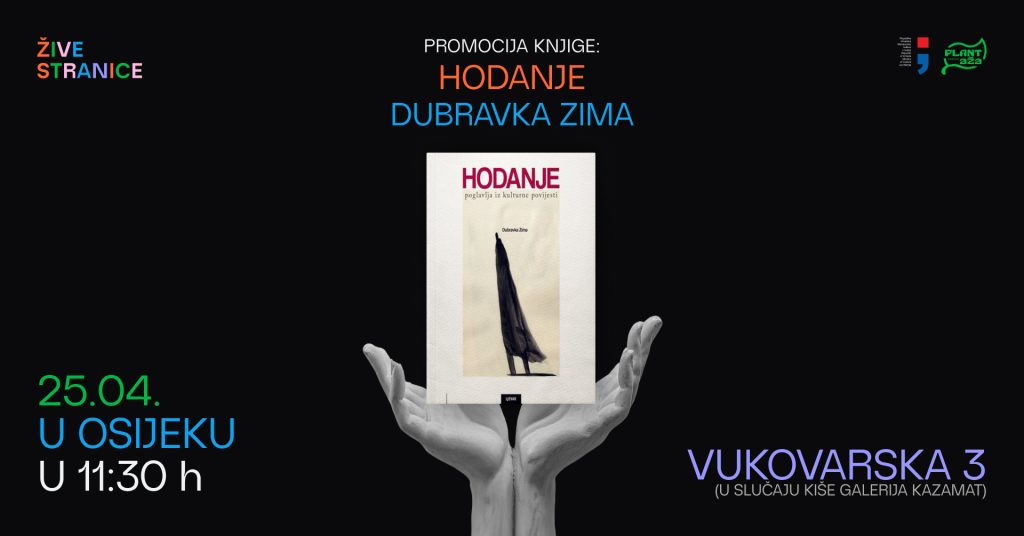 Udruga PLANTaža poziva na promociju knjige “Hodanje: poglavlja iz kulturne povijesti“ autorice Dubravke Zime, koja će se održati u subotu, 25. travnja u 11,30 sati na adresi Vukovarska 3. U slučaju nepovoljnih vremenskih uvjeta, događaj će biti premješten u Galeriju Kazamat.