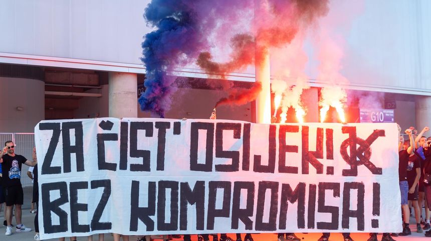 Osijek, 28.5.2024. – Navijači Osijeka su se večeras okupili ispred stadiona uz poruku “Za čist Osijek bez kompromisa”. Jasno su tako dali do znanja Portugalcu da stoje iza njega i da žele od institucija da se ovaj slučaj čim prije rasvijetli.