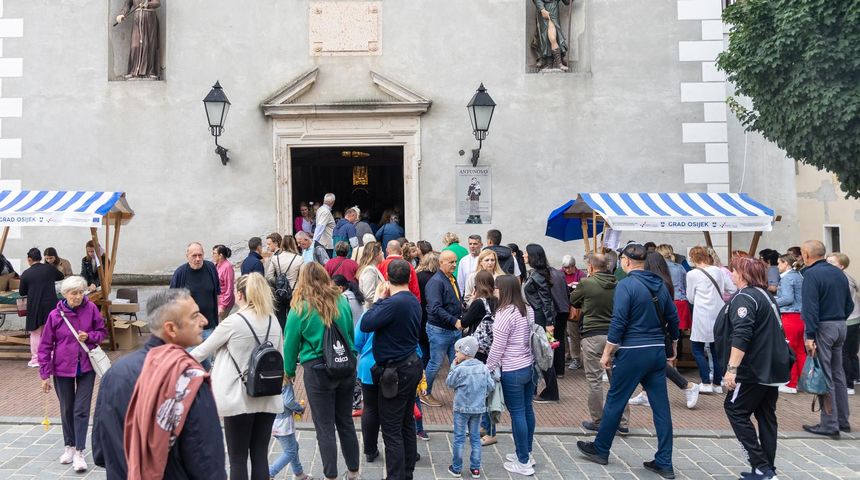 Osijek, 13.6.2024. – Blagdan sv. Antuna ove godine u Tvrđu je privukao nešto manji broj vjernika no što je to uobičajeno. Loše vrijeme i kiša koji su padali kroz cijeli dan odvratili su dio građana na posjet ovom svecu. Ipak tijekom poslijepodneva broj oni koji su se poželjeli pomoliti ili zabaviti u luna parku kod Školjke se povećao, a svi koji žele još stignu u Tvrđu.