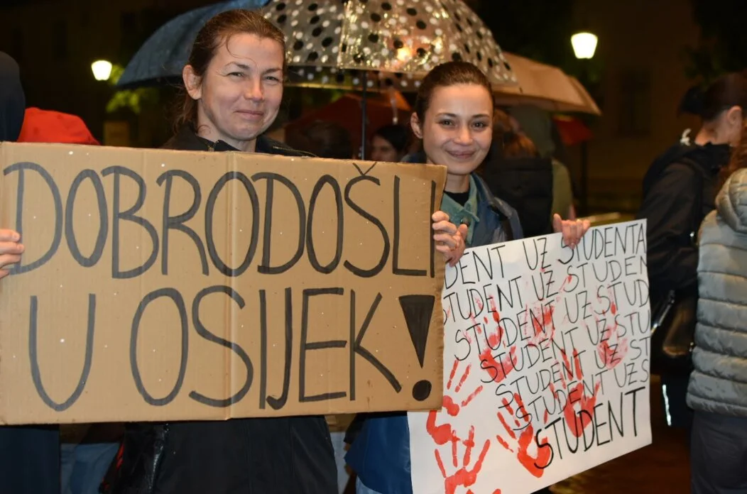 Osijek, 25.4.2025. – U petak, unatoč žestokoj kiši, 20-ak srpskih studenata u blokadi oko 23 sata uspješno su stigli u Osijek. Brojni osječki student i udruge predvođene inicijativom Student uz studenta priredili su im pravu, slavonsku dobrodošlicu. Trg Vatroslava Lisinskog orio se pjesmom, veseljem i poznatim uzvikom: „I drug je lega!” Studente su dočekali i transparenti puni podrške, voda, voće, deke i topli obroci, a nakon prolaska kroz pobjedničku vrpcu, dodijeljene su im medalje za ustrajnost i narukvice prijateljstva u bojama Grada. Bila je to zaista večer ispunjena energijom koja spaja i bukom otpora. Studenti su tako službeno krenuli prema Bruxellesu kako bi europskim službenicima ukazali na zahtjeve višemjesečnih protesta i blokada u Srbiji potaknutih padom nadstrešnice u Novom Sadu koja je odnijela 16 života. Za kraj programa dočeka, održano je 16 minuta tišine za poginule žrtve, a zatim su studenti otišli na počinak kako bi se pripremili za novu destinaciju – Viroviticu. Službeno su i kandidirani za Nobelovu nagradu za mir.