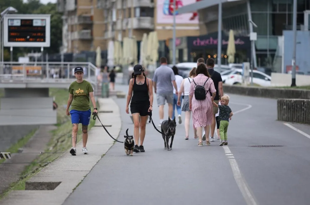 Osijek, 27.7.2025. – Iako vremenski uvjeti ove nedjelje nisu bili tipično ljetni, to nije spriječilo Osječane da iskoriste dan za šetnju najdužom riječnom šetnicom u Hrvatskoj – osječkom promenadom.
