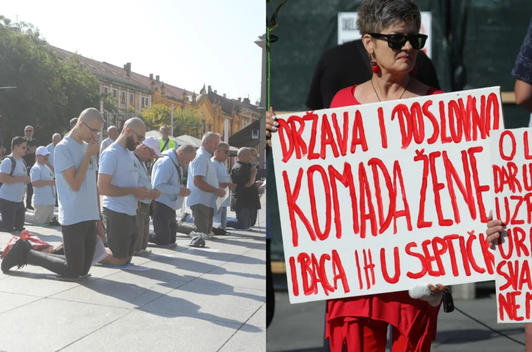 U Osijeku su se okupili na Trgu Pape Ivana Pavla II, odnosno točno ispred konkatedrale. Kao i svaki put, dočekali su ih prosvjednici, ovaj put s porukom “Država i doslovno komada žene i baca ih u septičku”, aludirajući na stravičan zločin iz Tenje u kojem je muškarac ubio suprugu, raskomadao ju i bacio u septičku jamu.