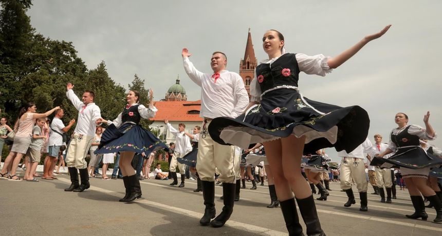 Đakovo, 4.7.2021. – Na glavnoj priredbi 55. Đakovačkih vezova danas su, u svečanom mimohodu središtem grada, prošle 42 folklorne skupine iz zemlje i inozemstva s 1800 sudionika, 30 zaprega i 70 jahača, a po prolasku mimohoda u katedrali sv. Petra misno slavlje predvodio je nadbiskup Đuro Hranić. U svečanom mimohodu vezova središtem Đakova prošli su i kandžijaši, kuburaši, lipicanci Državne ergele Đakovo, mažoretkinje, puhački orkestar DVD-a Đakovo, hrvatski ovčari i druge hrvatske pasmine pasa i drugi sudionici