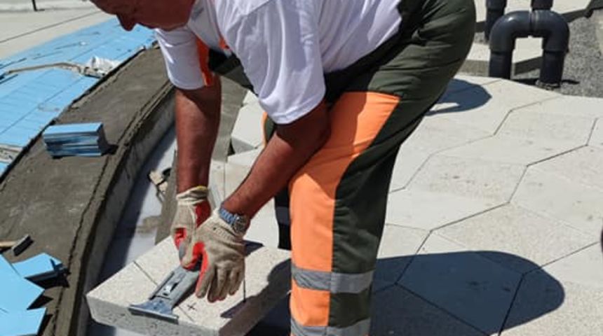 Osijek, 14.6.2022. – Radovi su u punom jeku, a tome svjedoče i radnici Unikomove radne jedinice “Prometnice” koji postavljaju betonske opločnike na pješačkim površinama oko bazena na Copacabani.