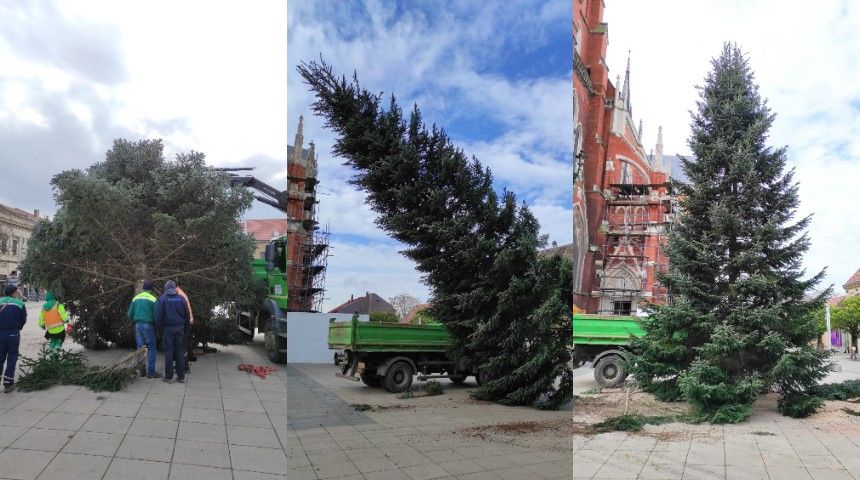 Osijek, 21.11.2022. – Ispred katedrale na trgu Ivana Pavla 2 tradicionalno je podignut bor kraj kojeg će se nalaziti adventski vijenac. Gradska tvrtka Unikom brzo je odradila ovu akciju, a slijedi ukrašavanje zelenog diva koji je i ove godine uistinu predivan.