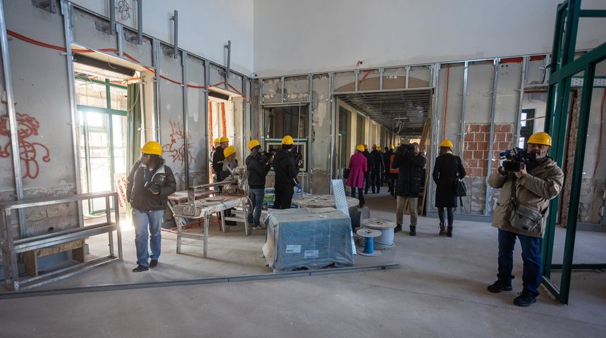 Osijek, 9.2.2023. – Završne radove na obnovi zgrade Željezničkog kolodvora Osijek danas (9. veljače 2023. godine) obišli su župan Osječko-baranjske županije Ivan Anušić, gradonačelnik Grada Osijeka Ivan Radić i predsjednik Uprave HŽ Infrastruktura Ivan Kršić. Radovi – čija ukupna vrijednost radova iznosi gotovo četiri milijuna eura – počeli su u travnju 2021. godine, odvijaju se planiranom dinamikom te je do sada obavljeno gotovo 90 posto planiranog posla. Izvođač radova je tvrtka Projektgradnja plus d.o.o. Gornja Vrba.