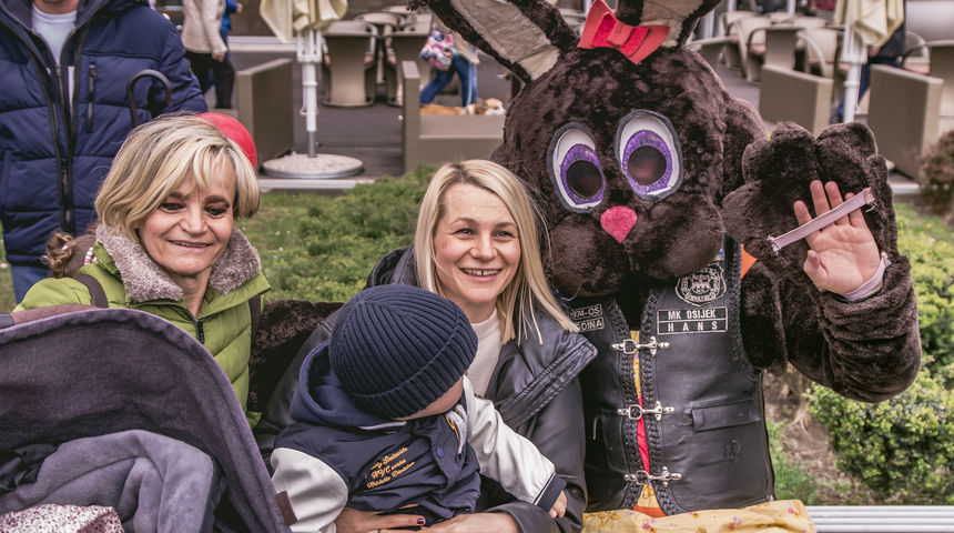 Osijek, 8.4.2023. – Motozeke još su jednom izvukli osmjehe na lice brojnih sugrađana u središtu Osijeka. Nemoguće je neprimijetiti ih kad uz puno buke ovi ljubitelji motocikala odjeveni u zekane stignu u grad, a najviše su im se kao i uvijek radovali najmlađi sugrađani.