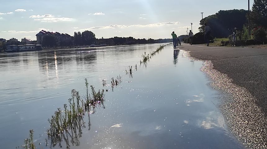Osijek, 11.8.2023. – Vodeni val stigao je do Osječko-baranjske županije i grada Osijeka gdje je danas u 17 sati izmjeren vodostaj od plus 358 cm, 8 cm iznad granice kad se proglašavaju redovne mjere obrane od poplava. Vrhunac vodostaja u Osijeku se očekuje tijekom subote prijepodneva, narast bi mogla do 470 cm prema najavama. Kako vidimo, Drava se već počela prelijevati na šetnicu na lijevoj obali.