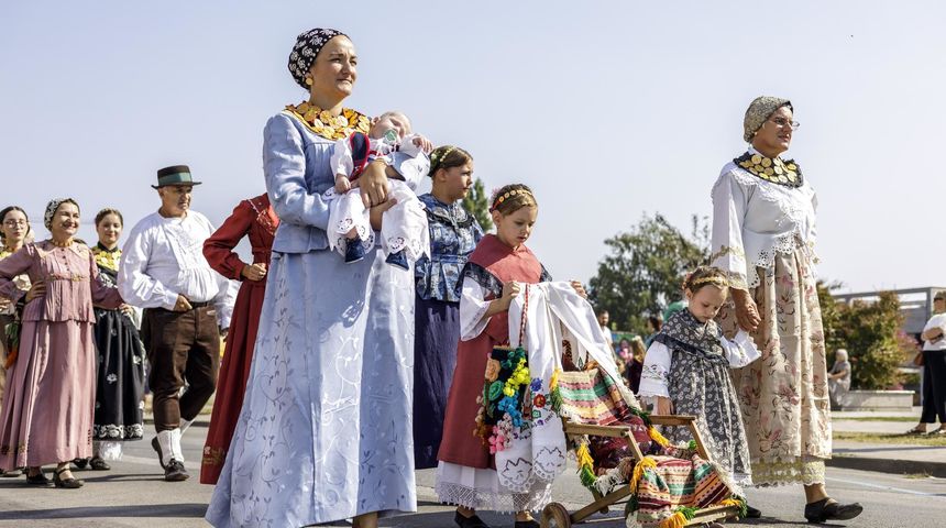 Vinkovci, 17.9.2023. – Nekoliko tisuća članova iz 65 kulturno-umjetničkih društava prošlo je u nedjelju ulicama Vinkovaca u svečanom mimohodu sudionika 58. Vinkovačkih jeseni, predstavljajući plesom i pjesmom kraj iz kojega dolaze. Svečani mimohod sudionika, središnja je priredba Vinkovačkih jeseni i održava se posljednjeg dana manifestacije i u programu sadrži i reviju konjskih zaprega i konjanika koja je ove godine međutim izostala uslijed epidemioloških mjera zbog afričke svinjske kuge koja hara dijelom Vukovarsko-srijemske županije. U povorci dugačkoj nekoliko kilometara, od Gradske tržnice do stadiona HNK Cibalije, članove folkornih skupina koji su se na glavnoj pozornici predstavili kratkim programom, pratilo je nekoliko desetaka tisuća posjetitelja, uživajući u bogatstvu narodnih nošnji te pjesmama i plesovima folkloraša pristiglih iz svih krajeva Hrvatske i dijaspore.