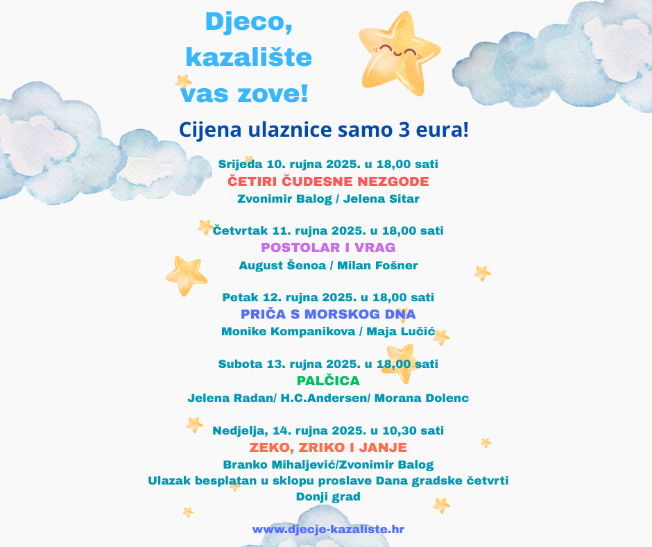 Sezonu, kao i uvijek, u Dječjem kazalištu Branka Mihaljevića započinju tradicionalnom manifestacijom na kojoj možete pogledati neke od najpopularnijih predstava od 10. do 14. rujna 2025.!