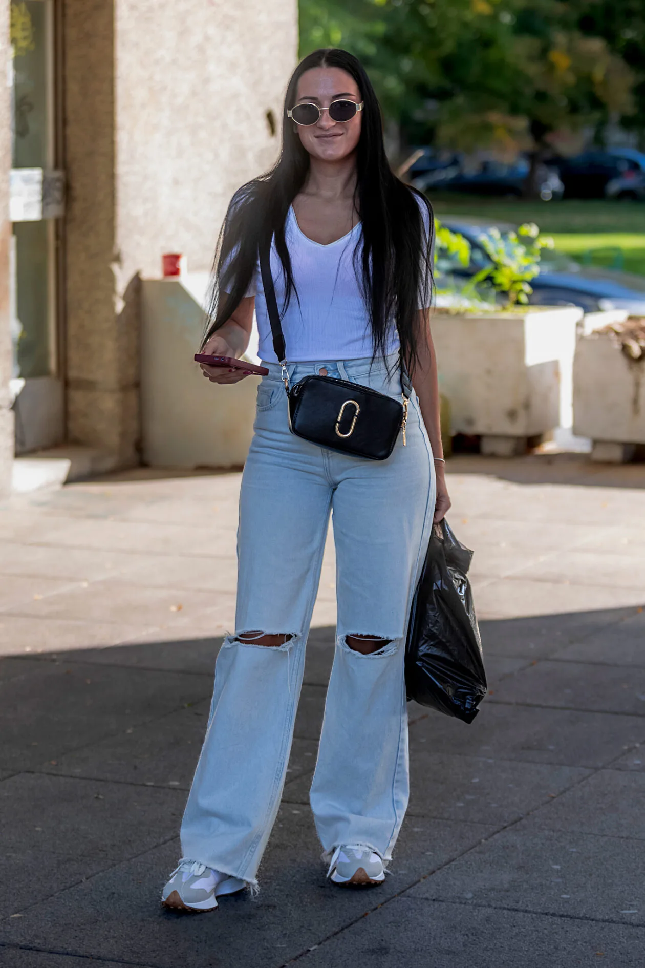 Desna legica zrači urbanim chicom: crop kožna jakna s bijelim obrubom je apsolutni statement komad! Ispod nje nazire se kratki top, a široke crne hlače visokog struka savršeno se uklapaju u trend prostranih silueta. Diskretna clutch torbica dodaje notu elegancije.