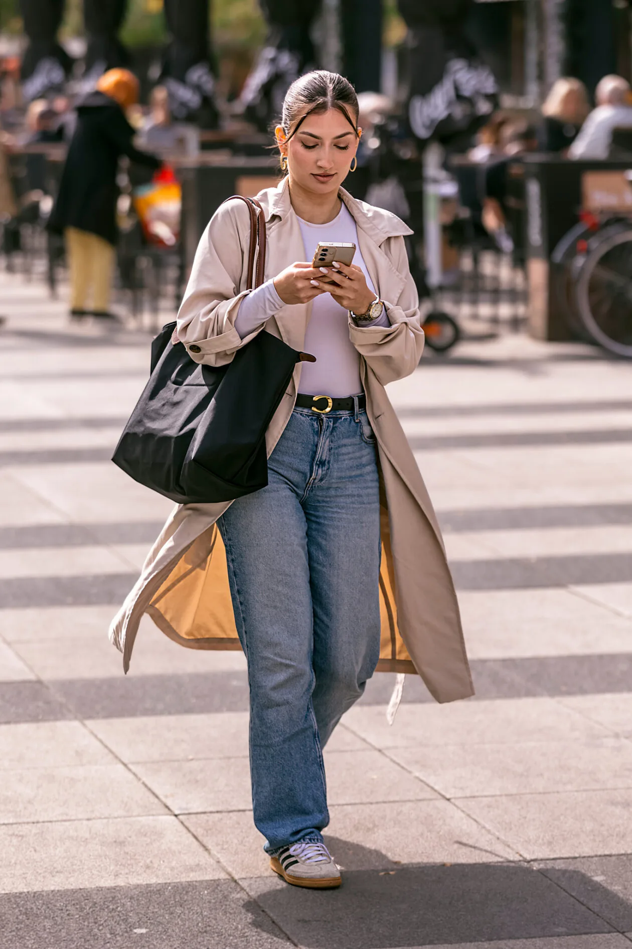 Uhvatili smo još jednu stylish legicu na Trgu slobode! Klasična kombinacija traperica i bijelog topa dobila je chic nadogradnju u obliku bež trenčkota, dok jednostavne tenisice i velika torba daju praktičan, urbani štih. Elegantna frizura i diskretni modni detalji poput zlatnih naušnica i sata zaokružuju cijeli look. Savršen primjer kako se jednostavno i moderno može šetati osječkim ulicama.