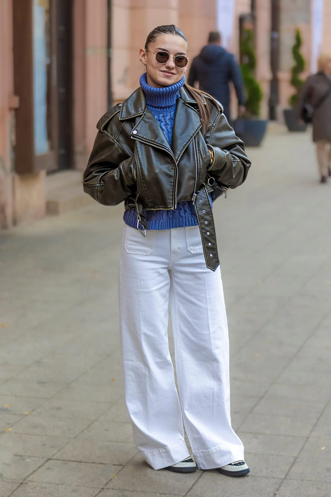 Kožna jakna, pleteni pulover i široke bijele hlače – kombinacija koja spaja klasiku i moderni street style! Plavi džemper unosi boju i toplinu, dok oversized kožnjak daje dozu edgy stava. Bijele hlače donose svježinu, a okrugle sunčane naočale dodaju cool završni detalj. Savršen spoj udobnosti i stila za jesensku šetnju gradom!
