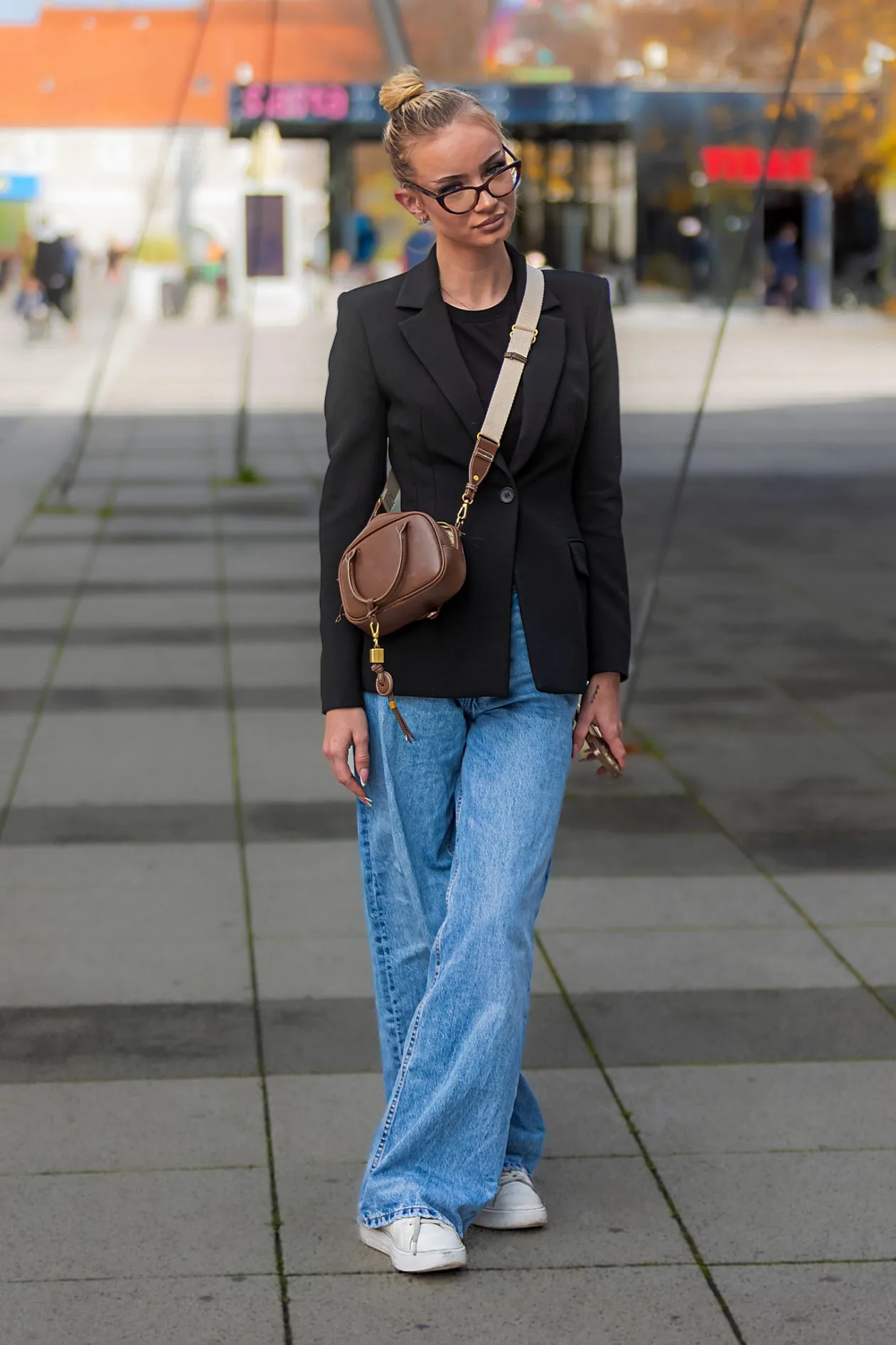 Ova mlada Osječanka spojila je udobnost i profinjenost u jednostavnom, ali pažljivo usklađenom izdanju. Crni sako naglašava njezinu figuru i daje ozbiljniji ton, dok široke traperice i bijele tenisice unose ležernost. Smeđa torba preko ramena, s detaljima u zlatnom tonu, dodatno zaokružuje look i unosi toplinu u cijelu kombinaciju. S kosom podignutom u punđu i diskretnim nakitom, odiše samouvjerenošću i stilom koji ne traži pažnju – nego ju prirodno privlači.