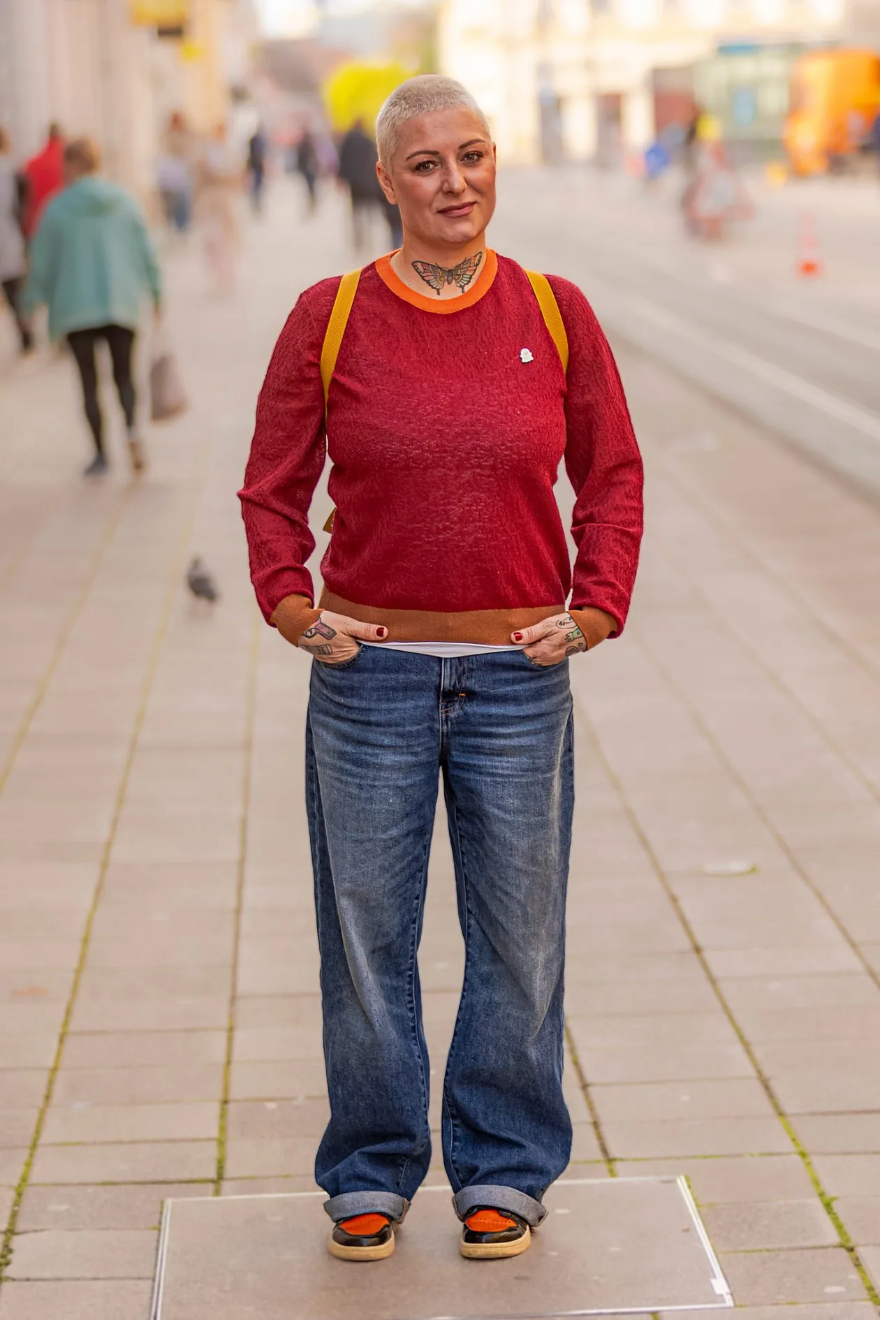 Ova legica s osječke promenade plijeni pažnju svojim jedinstvenim i samouvjerenim stilom. U ležernoj kombinaciji crvene majice, širokih traperica i upečatljivih tenisica, odiše stavom i osobnošću. Kratka frizura i tetovaže dodatno naglašavaju njezin autentičan, cool izgled koji ne prolazi nezapaženo.