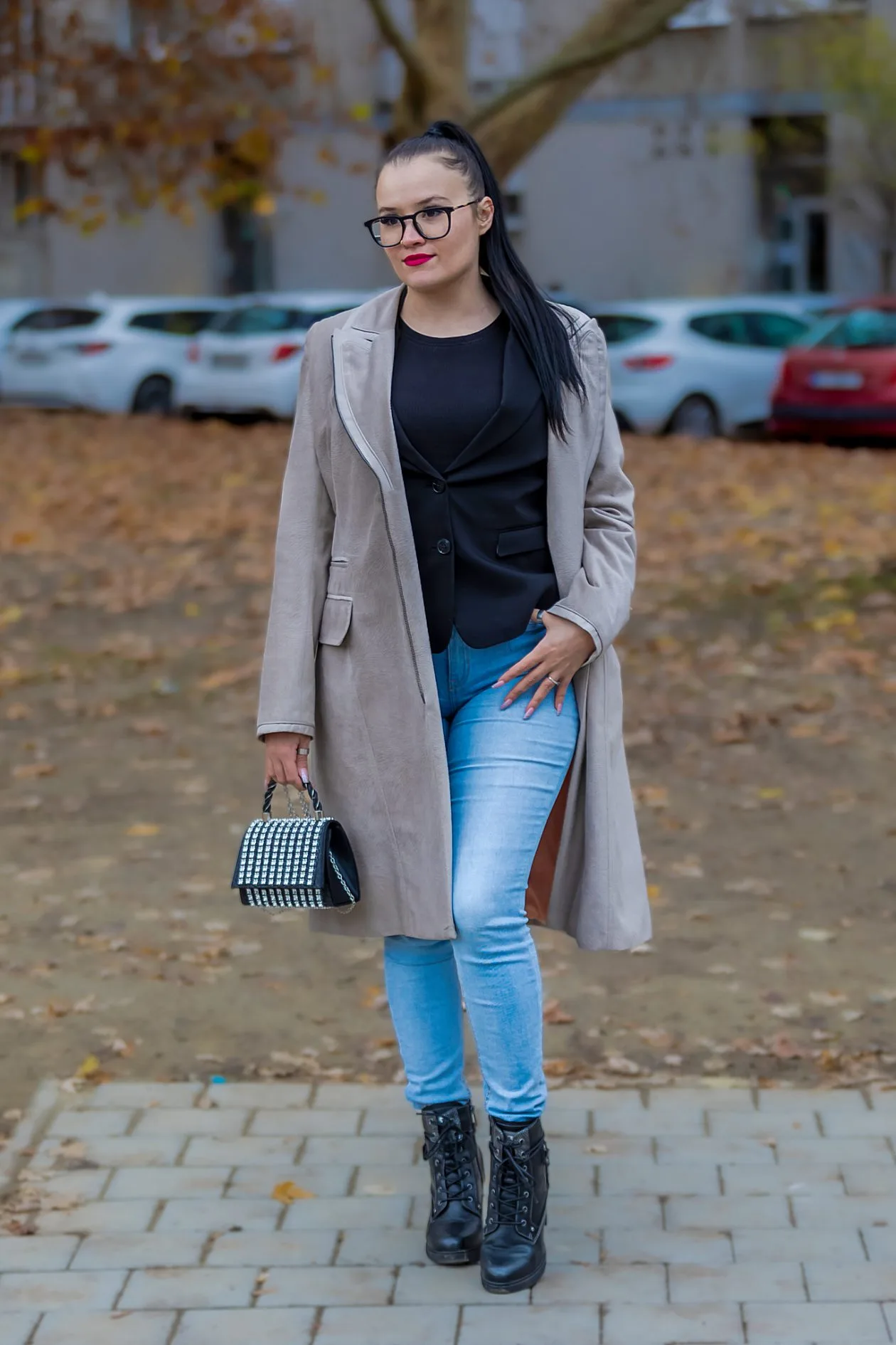 Ovaj outfit spaja urednu eleganciju i svakodnevnu praktičnost. Dugi bež kaput daje profinjen okvir cijeloj kombinaciji, dok crni gornji dio i strukirani sako donose urednu, chic liniju. Svijetle traperice unose ležernost, a crne čizme na vezanje dodaju dozu edgy energije. Mini torbica s metalnim detaljima lijepo podiže look i daje mu moderan, urban završetak. Jednostavno, dopadljivo i vrlo dobro izbalansirano za hladne dane.