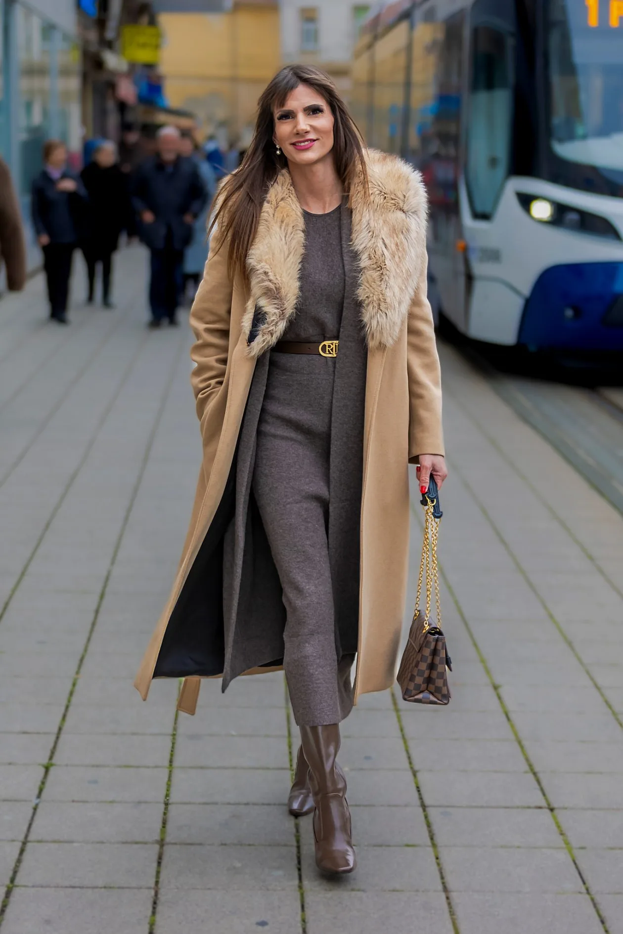 Današnja legica odiše elegancijom od glave do pete. Dugi kaput u toploj bež nijansi, ukrašen raskošnim krznenim ovratnikom, savršeno se slaže s njezinom pletenom haljinom i visokim smeđim čizmama. Detalji poput remena i torbice s lancem dodatno podižu kombinaciju, dok samouvjeren hod pokazuje da ova dama savršeno vlada gradskim stilom.