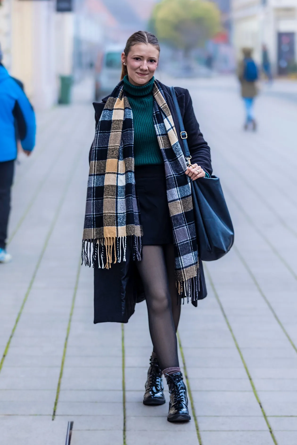 Današnja legica dana donosi topli, urbano posloženi zimski look koji savršeno funkcionira u maglovitom osječkom jutru. Dugi kaput, pleteni zeleni dolčevita-pulover i karirani šal stvaraju skladnu kombinaciju, dok kratka suknja i prozirne najlonke dodaju dozu mladenačke energije. Crne lakirane čizme i velika torba zaokružuju outfit – praktičan, moderan i idealan za šetnju gradskim središtem.