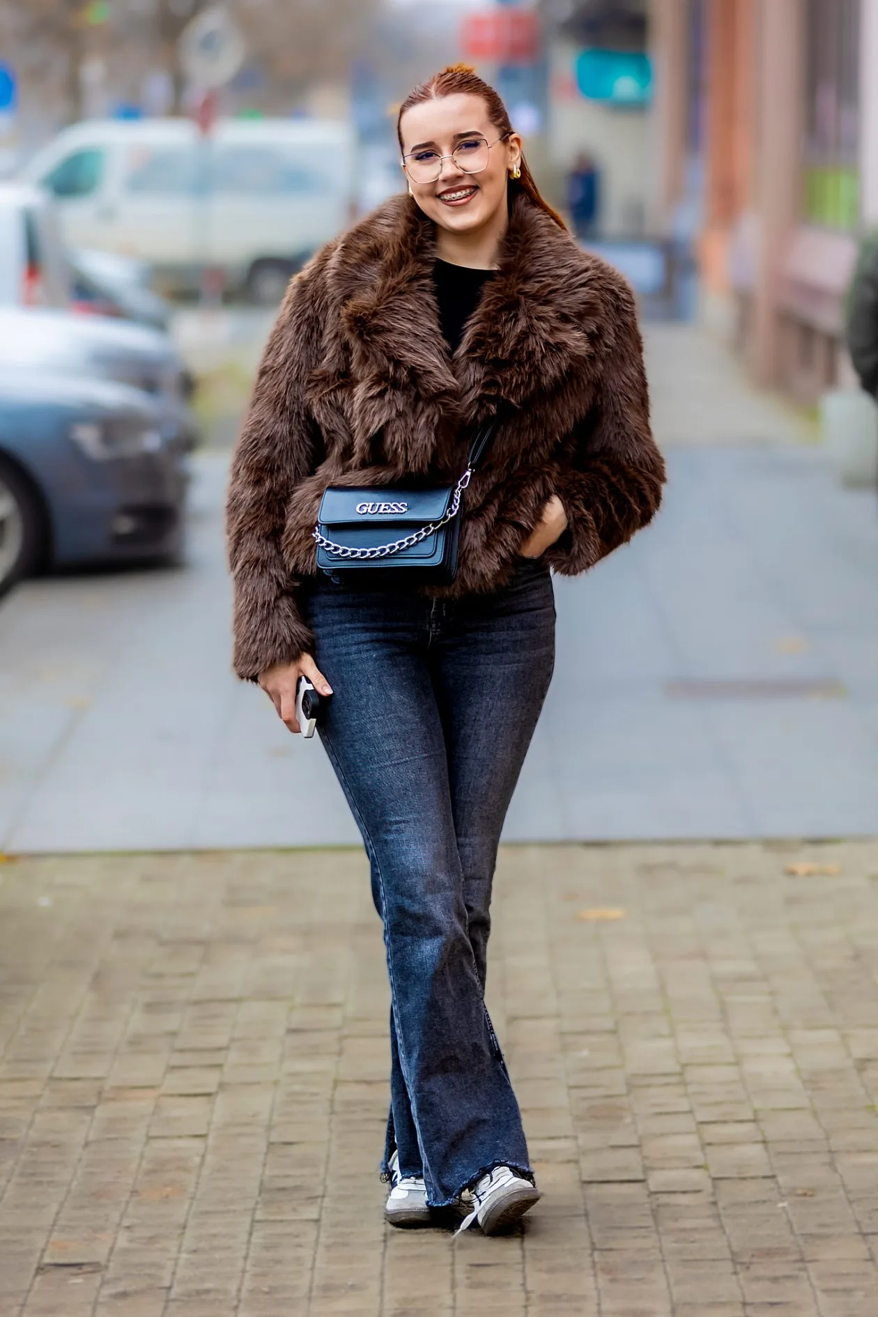 Ovaj outfit savršeno spaja udobnost i efektan stil. Krznena smeđa jakna daje dojam topline i glamura, a u kombinaciji s tamnim trapericama ravnog, blago trapez kroja stvara lijepu, izduženu siluetu. Bijele tenisice dodaju ležernu, sportsku notu, dok mala crna torbica s metalnim detaljima unosi dozu modernog šika. Stajling je istovremeno mekan, upečatljiv i vrlo nosiv za hladne gradske dane – jednostavno sjajan izbor!