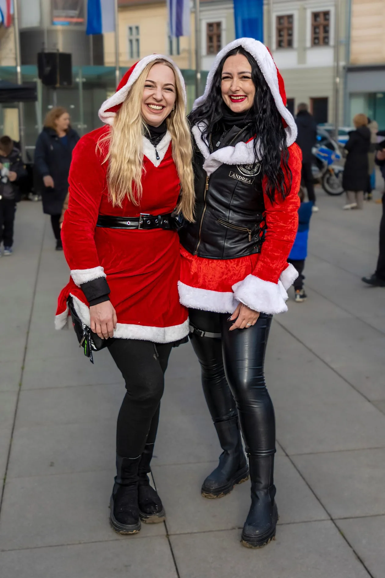 Ovaj veseli dvojac donosi pravi božićni duh u modernoj, urbanoj verziji. Klasični crveni kostimi inspirirani Djedom Božićnjakom izgledaju odlično, a svaki je stiliziran na svoj način: lijeva kombinacija ide na udobnost s tamnim hlačama i robustnim čizmama, dok desna verzija ima više „biker“ vibru zahvaljujući kožnom prsluku i sjajnim crnim tajicama koje daju moćan kontrast crvenoj. Toplo, zabavno, upečatljivo – pravi blagdanski street style Motomrazica koji širi osmijeh!