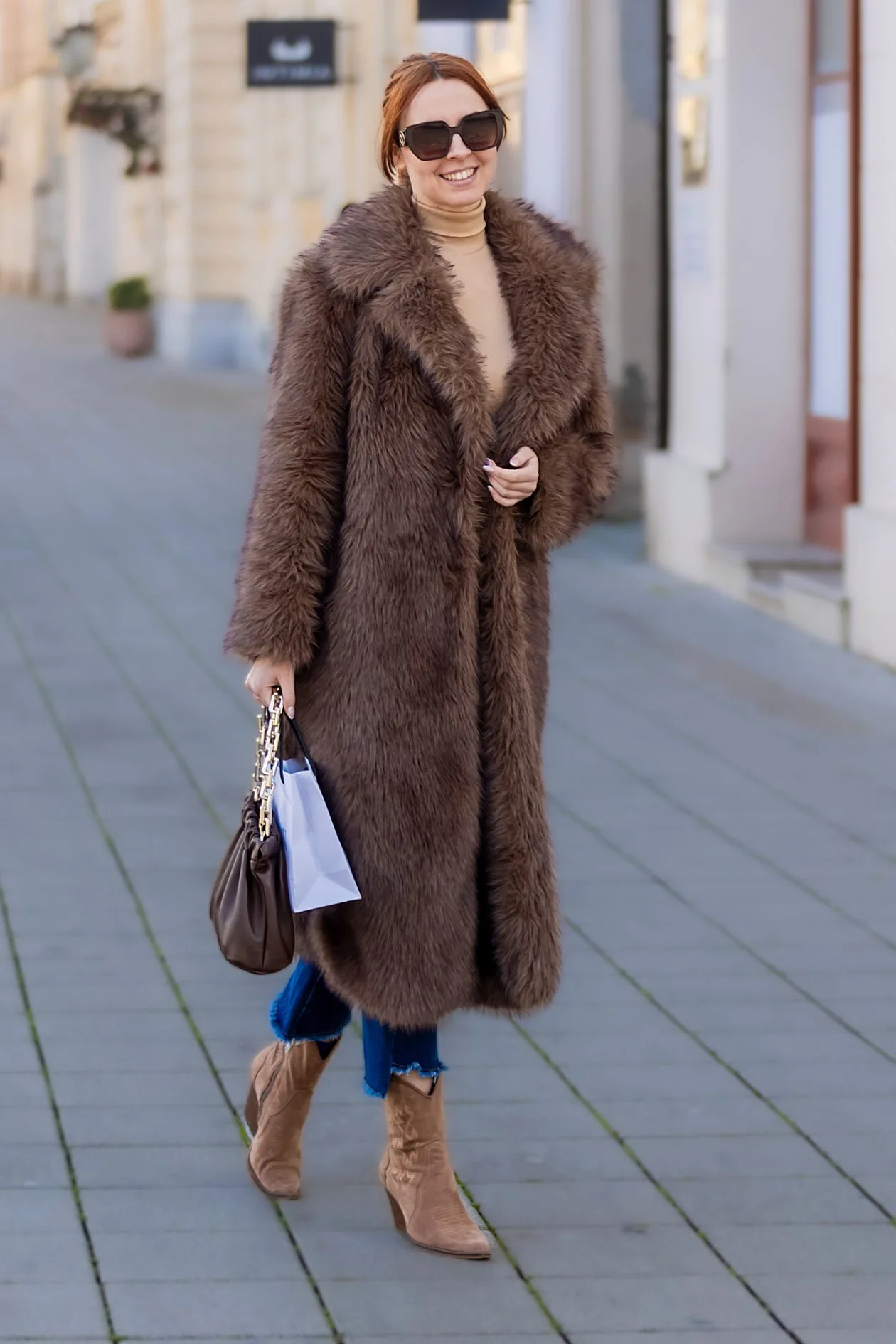 Ova legica donosi pravu zimsku eleganciju na osječke ulice. Dugi smeđi teddy kaput izgleda raskošno i toplo, dok ga bež dolčevita i chic čizme u istoj nijansi savršeno nadopunjuju. Poderane skinny traperice daju outfitu moderan, mladenački kontrast. Oversized sunčane naočale i torbica s upečatljivim zlatnim lancem zaokružuju styling koji pršti samopouzdanjem. Udobno, moderno i vrlo in — baš onako kako Osječanke vole.