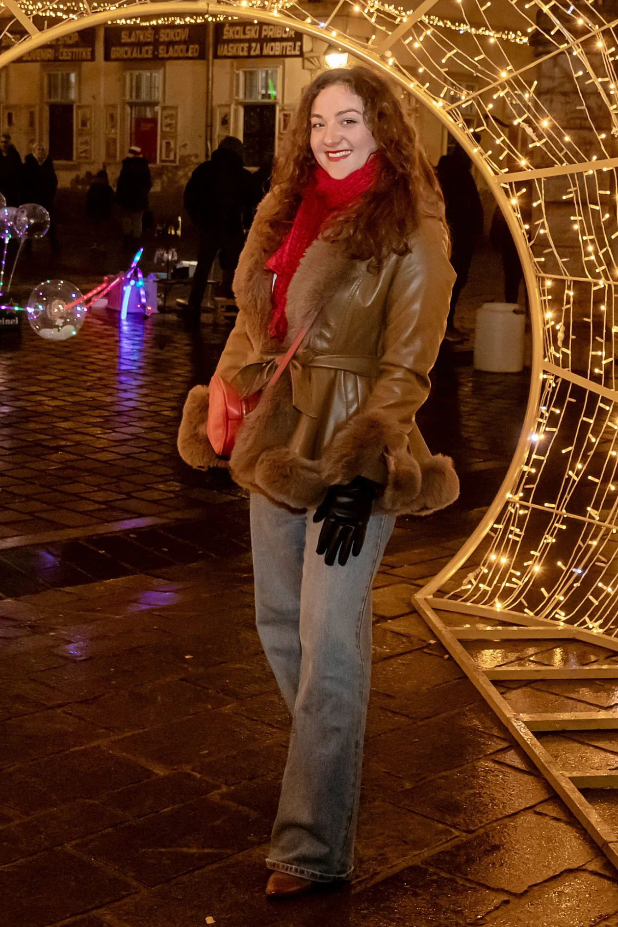 Smeđa jakna s krznenim rubovima daje ovom looku pravi zimski šarm, dok crveni šal unosi boju i blagdanski naglasak. Svijetle traperice i klasične cipele drže kombinaciju jednostavnom i nosivom, a mala torbica lijepo povezuje cijeli styling. Toplo, ženstveno i savršeno uklopljeno u večernju blagdansku atmosferu grada.