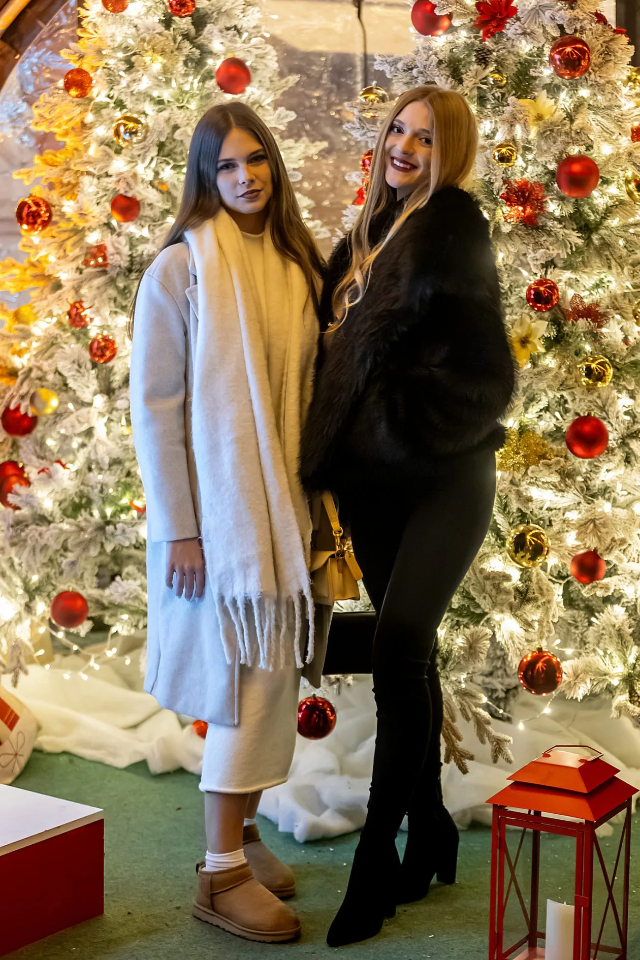 Ove dvije legice s Adventa u Osijeku utjelovljuju elegantnu, blagdansku zimsku estetiku. Legica s lijeve strane bira nježne, svijetle tonove – dugi kaput u bež nijansi, mekani šal i neutralne čizmice stvaraju profinjen i vrlo skladan look, idealan za mirnu adventsku šetnju. Njezina prijateljica donosi dozu glamura: crna bunda, uske hlače i visoke čizme na petu naglašavaju siluetu i daju cijeloj kombinaciji večernji, pomalo luksuzni štih. Zajedno djeluju elegantno, moderno i savršeno uklopljeno u toplu, blagdansku kulisu Adventa.