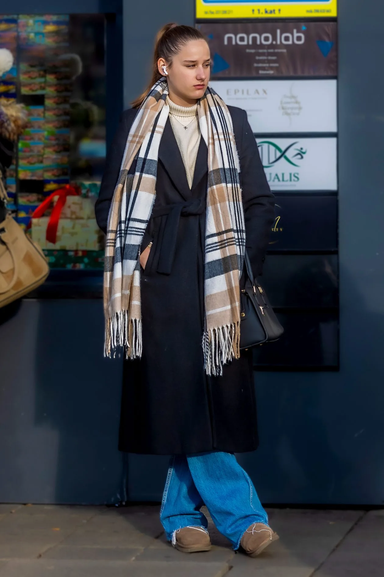 Ova legica donosi profinjen, ali izrazito nosiv lifestyle look koji savršeno spaja gradsku eleganciju i svakodnevnu praktičnost. Dugi crni kaput vezan u struku daje silueti urednu liniju, dok karirani šal u toplim bež tonovima unosi dozu klasične sofisticiranosti. Široke traperice i udobne cipele otkrivaju da je riječ o djevojci koja cijeni komfor, ali ne odustaje od stila, a decentna torbica i minimalistički detalji zaokružuju outfit koji djeluje promišljeno i moderno. Look za dinamičan gradski dan – nenametljiv, ali itekako zamjetan.