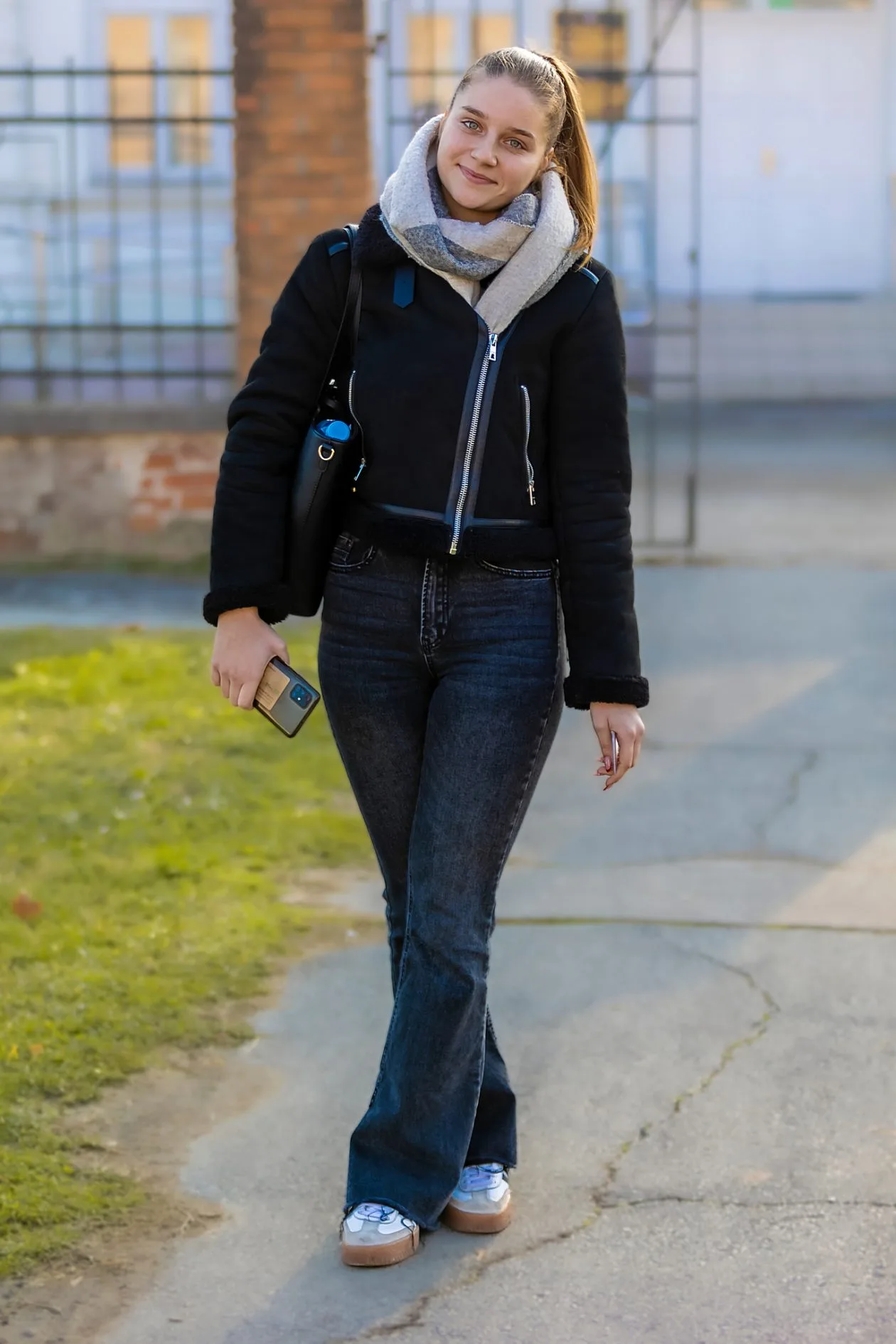 Današnja legica bira jednostavan, ali vrlo efektan urbani styling. Crna kratka jakna s naglašenim patentnim zatvaračem daje outfitu strukturu i blagu dozu sportskog štiha, dok mekani sivi šal unosi toplinu i vizualni kontrast. Tamne trapez traperice lijepo izdužuju siluetu, a udobne tenisice potvrđuju da je praktičnost ovdje jednako važna kao i izgled. Cijeli look djeluje prirodno, nenametljivo i svježe – idealan primjer kako uz minimalne komade postići dojam samouvjerene, moderne gradske djevojke.