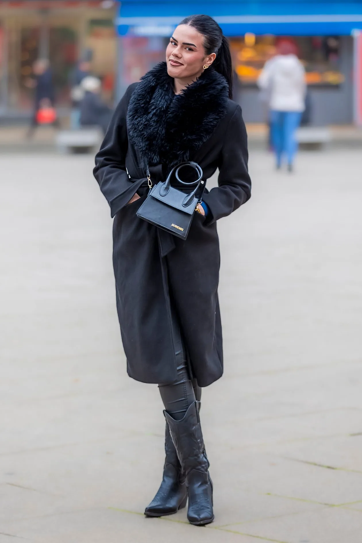 I ova legica bira bezvremensku eleganciju s dozom samopouzdanja. Crni kaput klasičnog kroja s izraženim krznenim ovratnikom daje cijelom izgledu luksuznu notu, dok uske hlače i visoke crne čizme dodatno naglašavaju ženstvenu siluetu. Poseban naglasak je na strukturiranoj crnoj torbici koja podiže outfit na višu modnu razinu, a decentni nakit i zalizana frizura upotpunjuju dojam dotjeranosti. Ovo je styling koji jasno poručuje – jednostavno, moćno i elegantno, savršeno uklopljeno u gradski ritam korza.