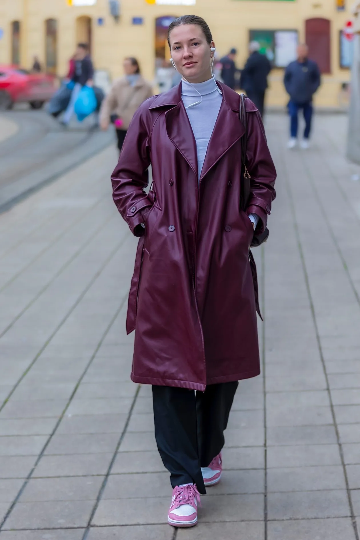 Na božićno jutro legica je obukla bordo kožni baloner daje snažan, trendi statement, dok siva dolčevita i crne hlače smiruju cijelu kombinaciju. Ružičaste tenisice unose svježinu i ležernu notu, savršenu za gradski tempo. Jednostavno, moderno i jako nosivo.