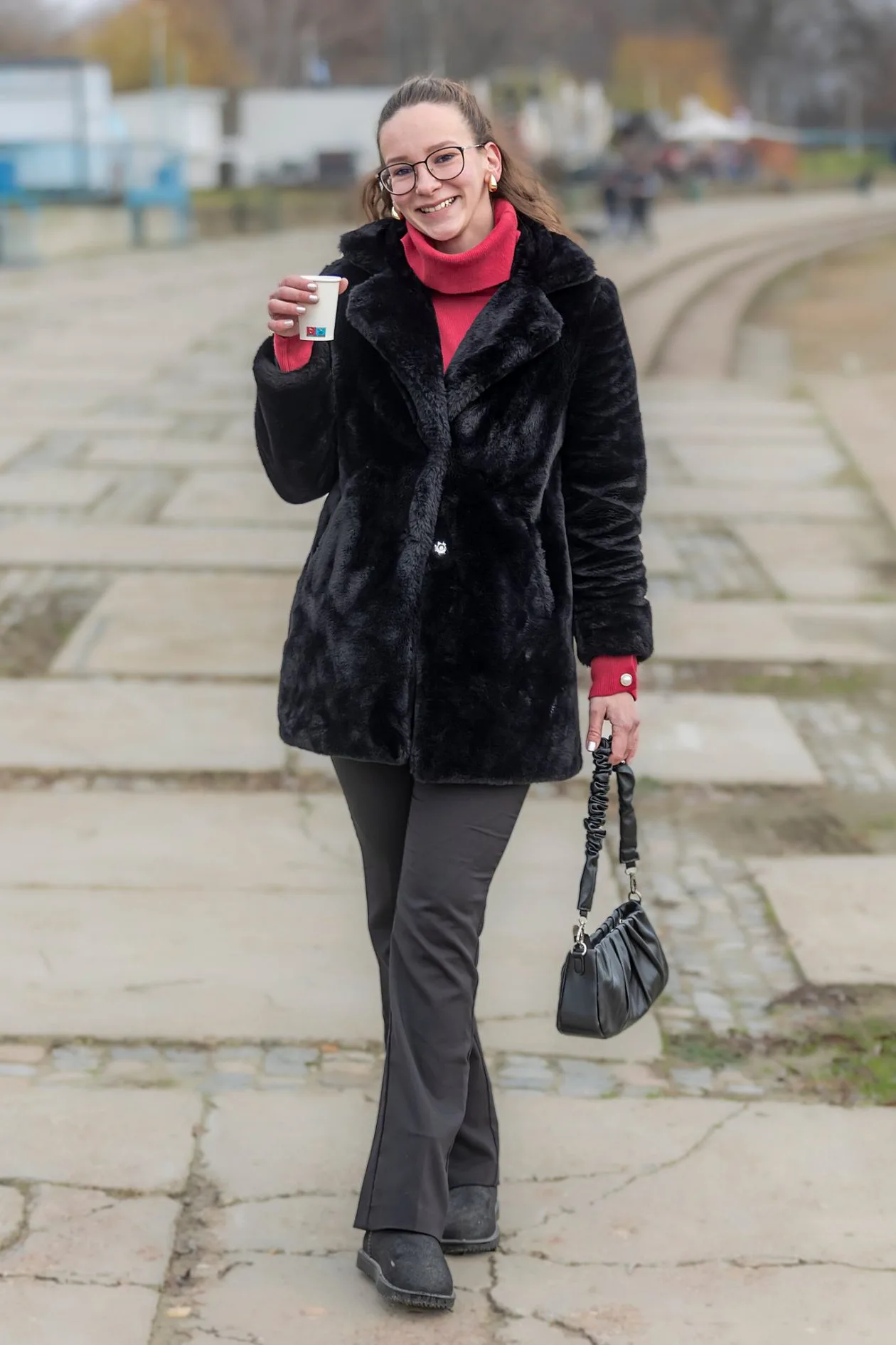 Ova legica s Kopike odiše ležernom elegancijom i dobrom energijom. Crni krzneni kaput u kombinaciji s crvenom dolčevitom daje snažan, ali skladan kontrast, dok crne hlače i gležnjače zadržavaju jednostavnost i praktičnost. Mala crna torbica i šalica kave u ruci zaokružuju opušteni zimski styling, savršen za šetnju uz Dravu.