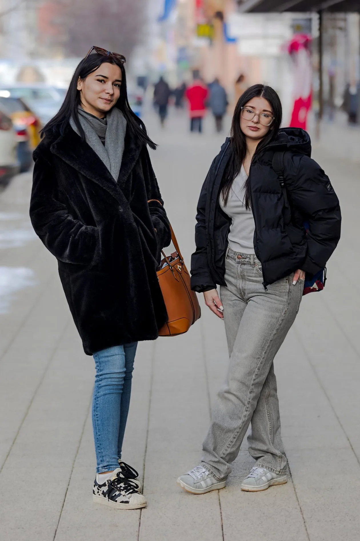 Dvije legice snimljene u centru grada odišu urbanim zimskim stilom. Jedna je u elegantnom crnom kaputu s velikom torbom i trapericama, dok druga bira ležerniju kombinaciju – kratku puffer jaknu, sivu majicu i traperice. Obje djeluju samouvjereno i opušteno, savršeno uklopljene u gradski ritam.