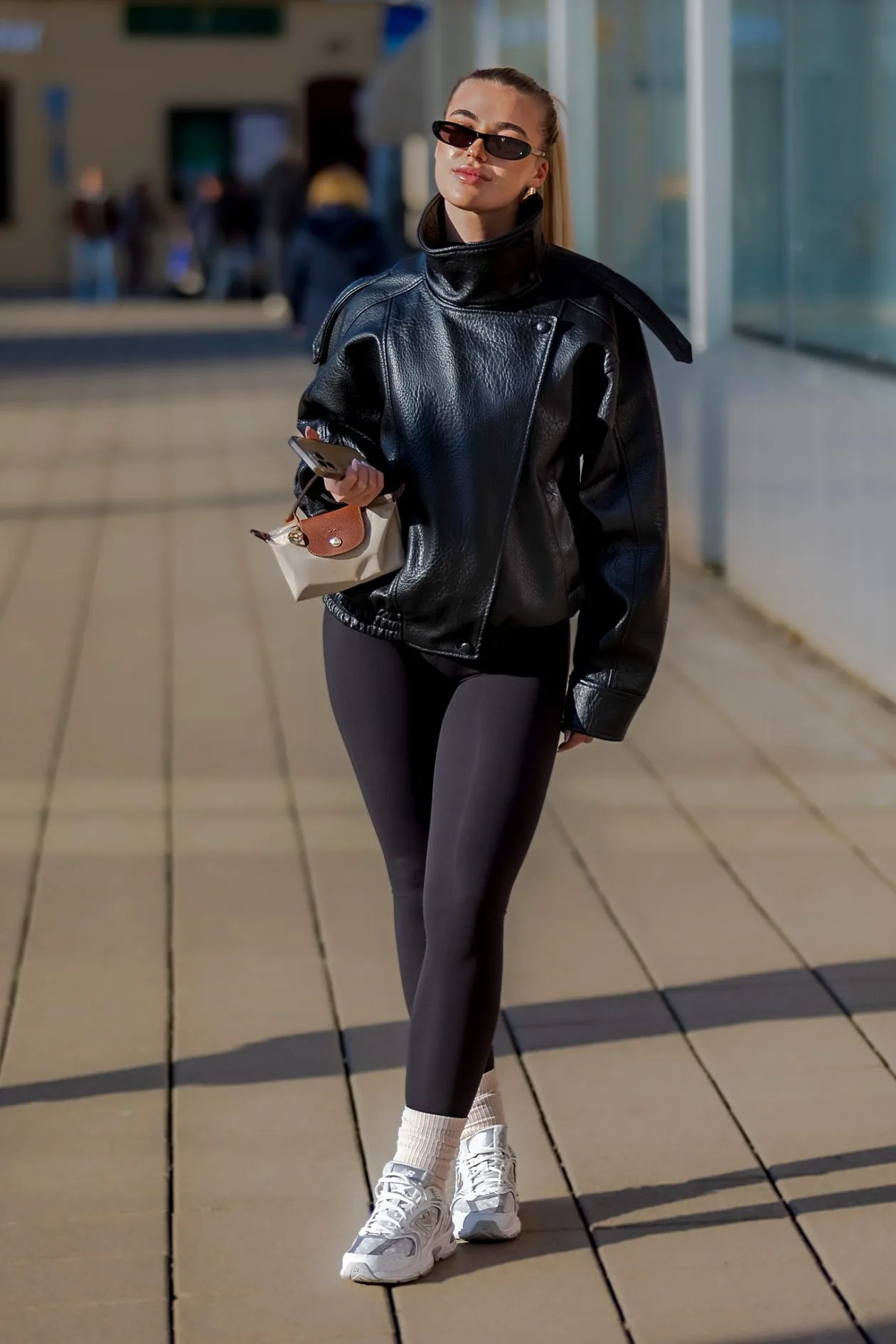 Današnja legica fura urbani, trendi stil – predimenzionirana crna kožna jakna, crne tajice i bijele tenisice daju joj sportsko-fashion vibe. Uske sunčane naočale, zalizana kosa i mala torbica zaokružuju sređen, samouvjeren gradski look.