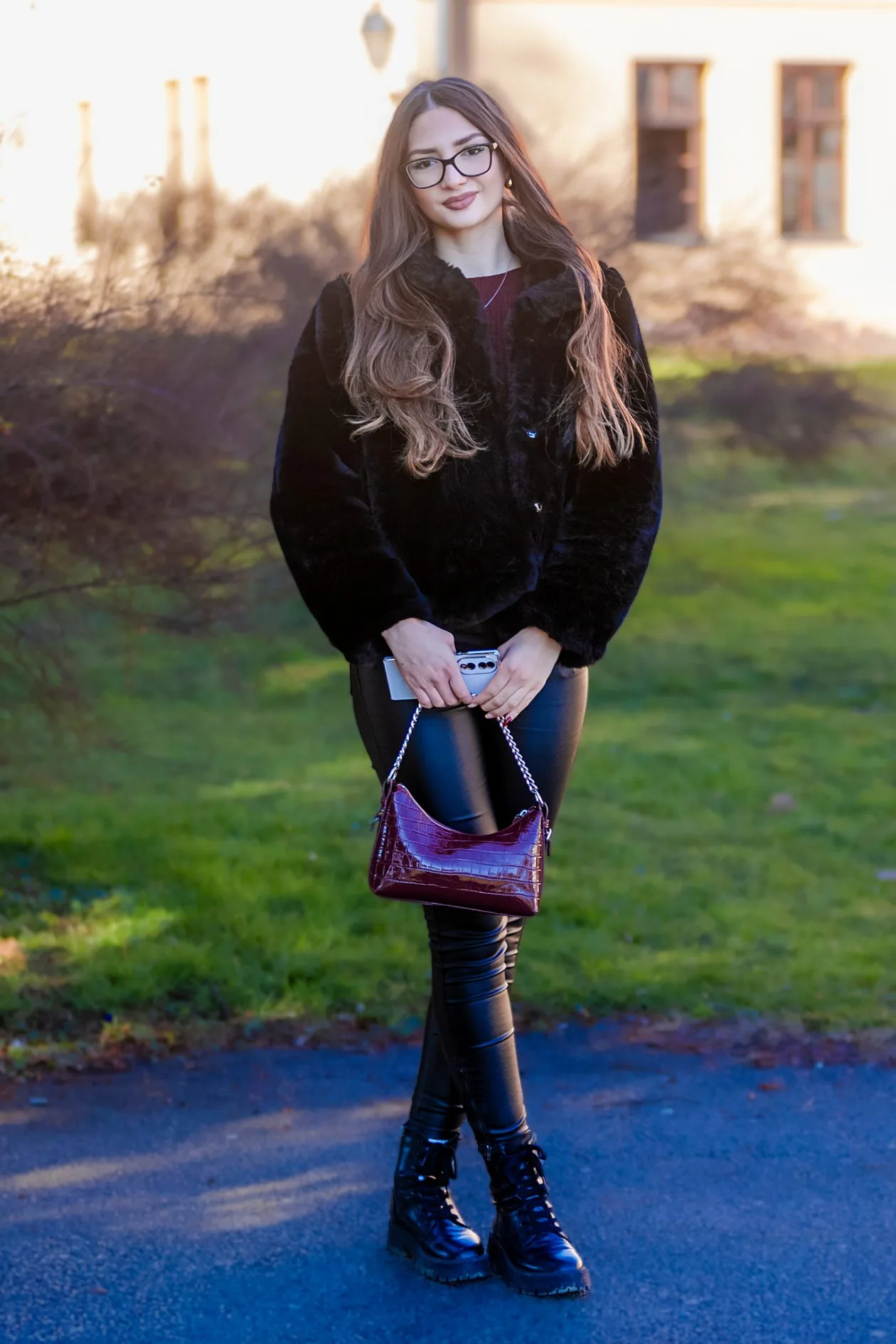 Ova legica bira elegantni zimski đir – crna krznena jaknica i uske kožne hlače daju dozu glamura, dok robusne čizme spuštaju kombinaciju na street razinu. Bordo torbica s lancem i naočale s dioptrijom zaokružuju profinjeni, ali i dalje skroz nosiv gradski look.