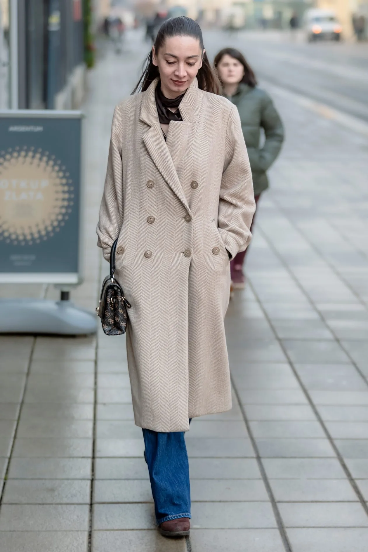 Današnja legica bira bezvremensku eleganciju – dugi bež kaput s decentnim uzorkom daje cijelom izdanju profinjen, gradski štih. Kombinacija s trapericama i klasičnim cipelama djeluje nenametljivo, dok mala torbica diskretno zaokružuje uredan i vrlo nosiv outfit za svakodnevne šetnje gradom.