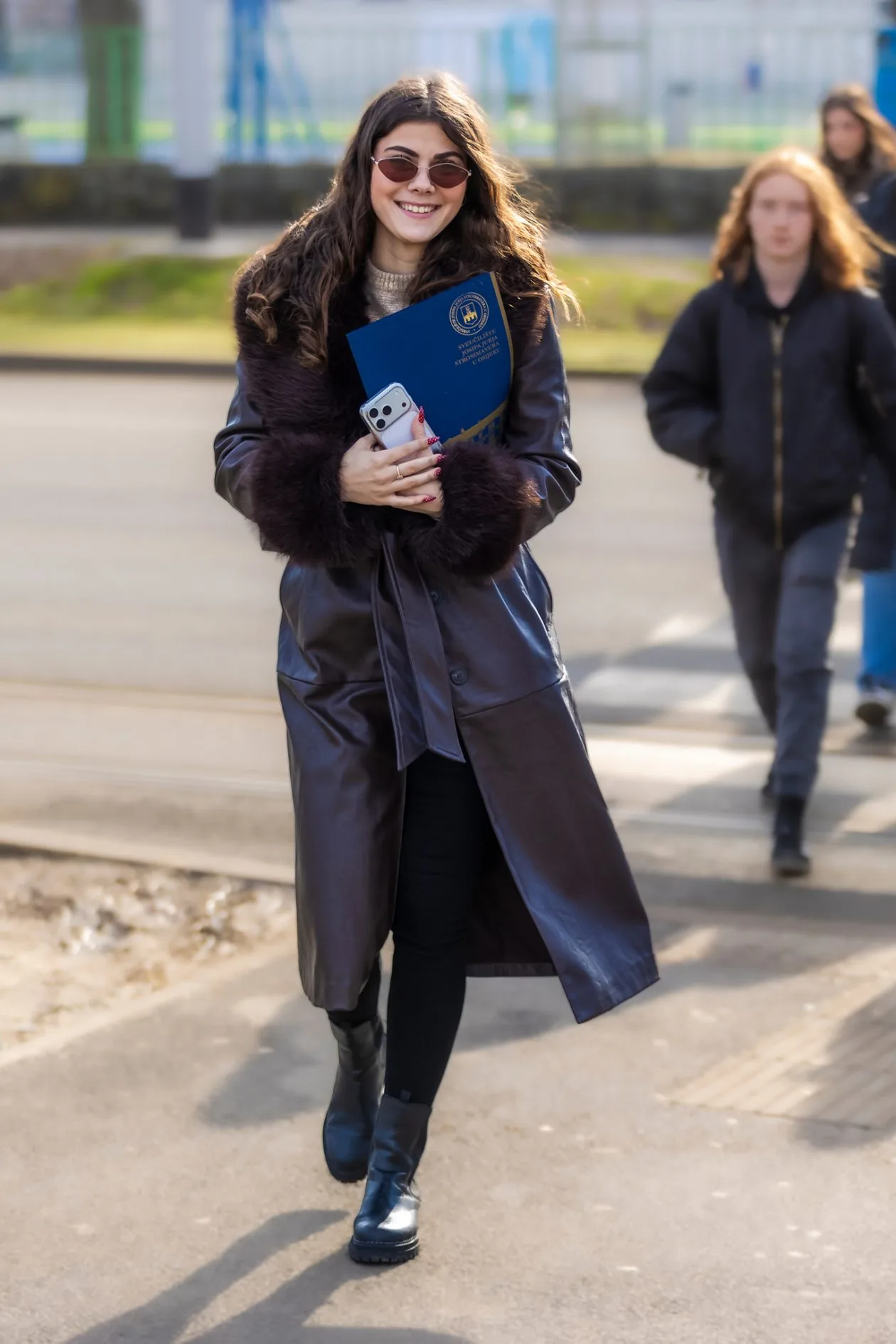 Ova legica donosi savršeni spoj urbanog chica i sofisticirane elegancije. Kožni kaput s mekanim krznenim detaljima jedan je od najvećih hitova sezone, a u kombinaciji s crnim hlačama i gležnjačama stvara bezvremenski, moćan look. Sunčane naočale i minimalistički modni dodaci dodatno naglašavaju njezin samouvjeren stil. Dokaz da se pravi trendovi nose s osmijehom – i stavom.