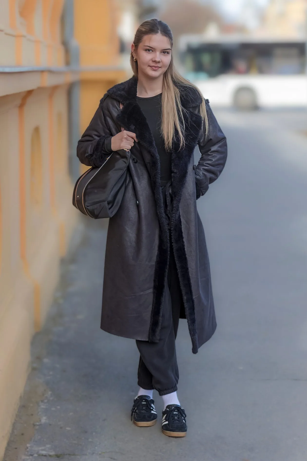 Ova legica bira ležerni “city casual” s dozom trendovske nonšalancije. Dugi kaput s krznenim rubom daje toplinu i karakter outfitu, dok trenirka i tenisice donose opuštenu, studentsku vibru. Jednostavna crna torba zaokružuje priču – praktično, udobno i moderno, baš kako izgleda svakodnevica u gradu.