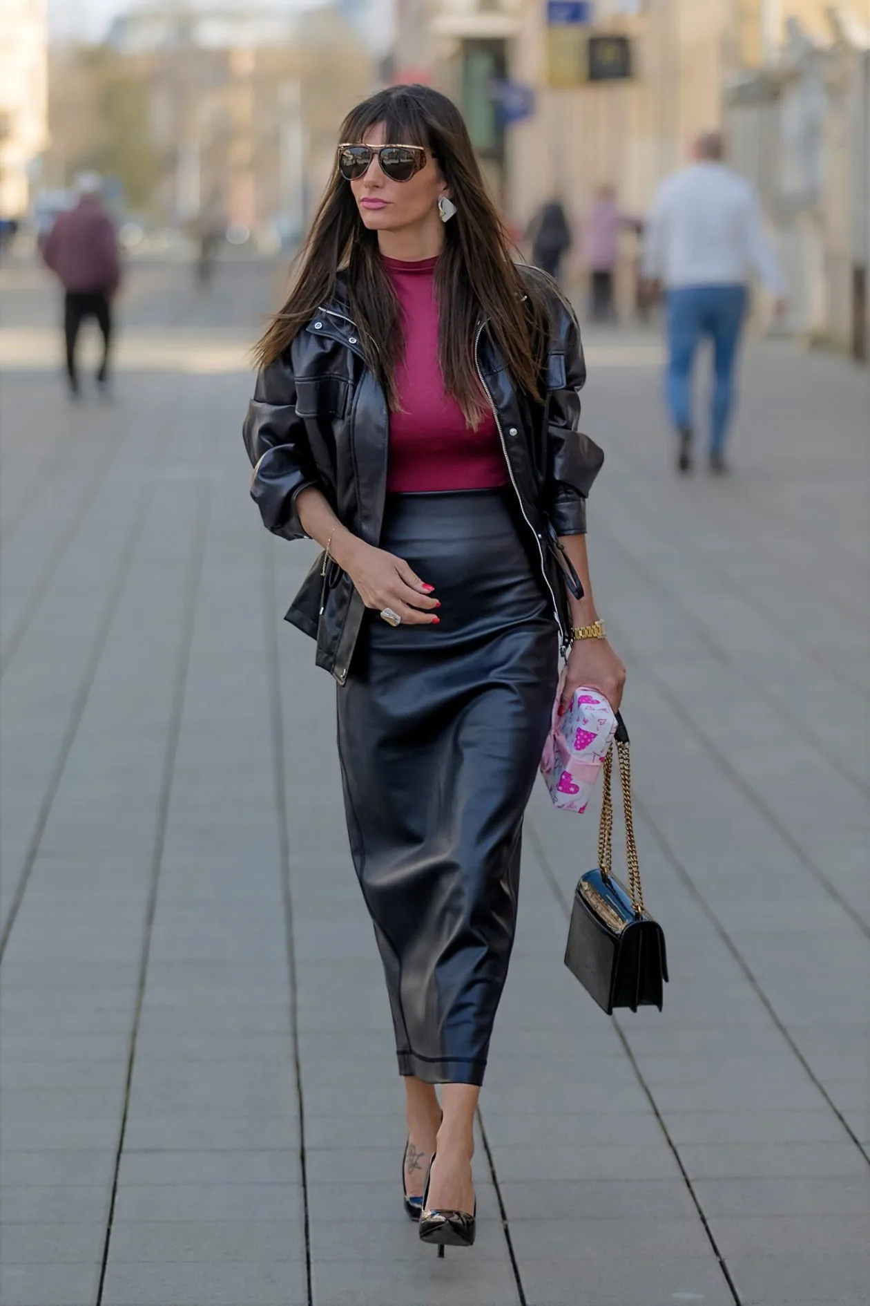 Ova legica pokazuje kako se odvažni komadi mogu pretvoriti u savršen gradski look. Kožna suknja midi dužine i crna kožna jakna daju outfitu snažan, urbani karakter, dok bordo top unosi toplinu i elegantan kontrast. Sunčane naočale, efektne naušnice i torbica s lancem dodatno naglašavaju sofisticirani stil, dok visoke potpetice cijeloj kombinaciji daju dozu glamura. Samouvjereno, moderno i s jasnim modnim potpisom – pravi street style trenutak.