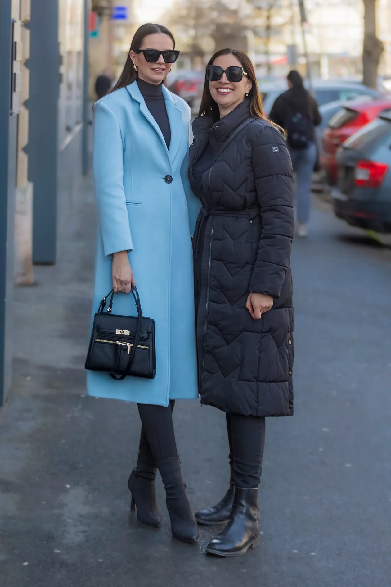 Dvije legice pokazale su dva različita, ali jednako stylish gradska outfita. Lijeva se odlučila za elegantan look s upečatljivim svijetloplavim kaputom koji kombinira s crnom dolčevitom, uskim hlačama i čizmama. Sunčane naočale i mala torbica dodatno naglašavaju profinjeni dojam. Njezina prijateljica bira nešto opušteniju kombinaciju – dugi crni puffer kaput uz tamne hlače i gležnjače. Look je praktičan, moderan i savršen za ležernu šetnju gradom.