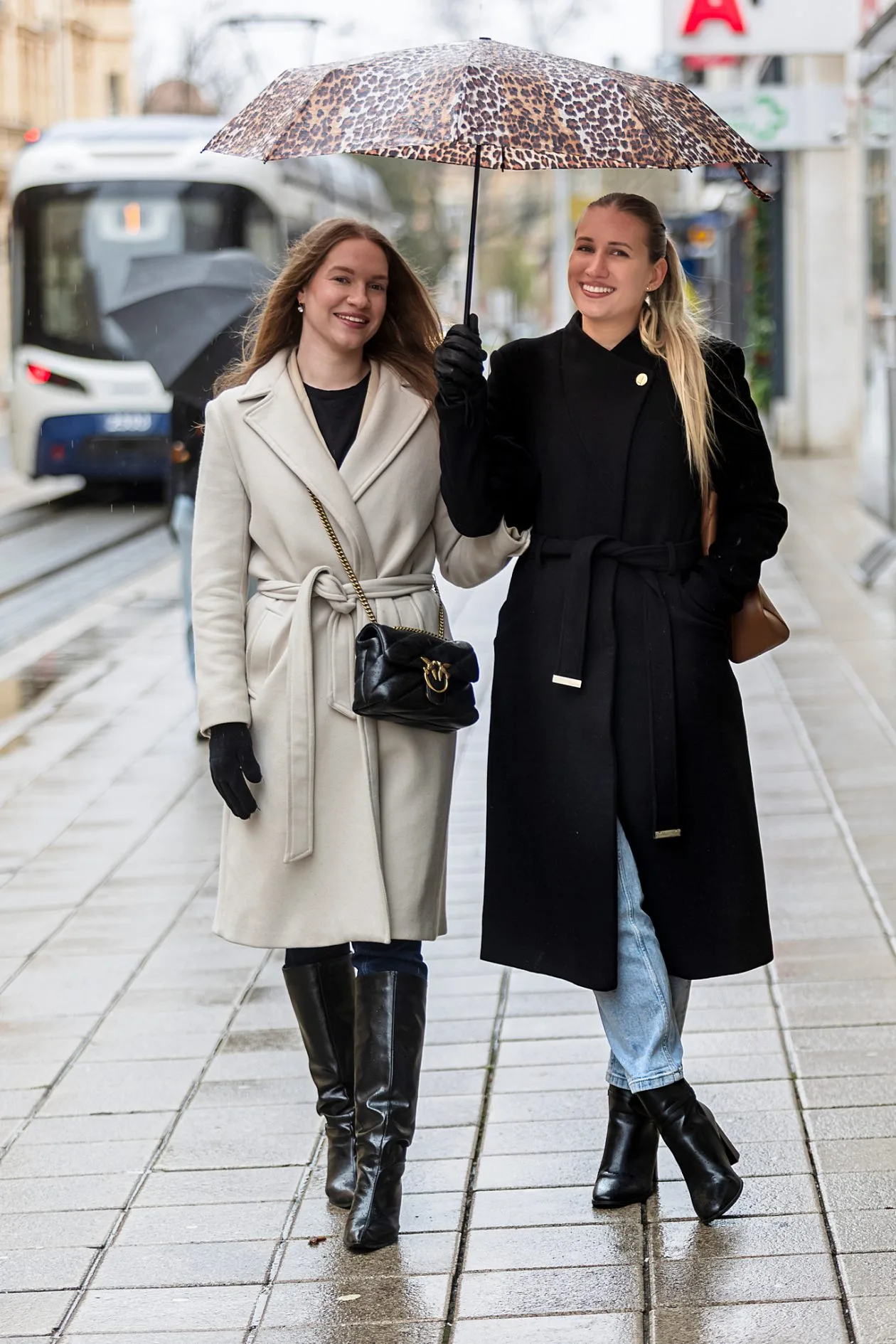 Dvije prijateljice, jedan leopard kišobran i savršen dokaz da kiša ne kvari style — prva nosi krem vuneni kaput s remenom uz crne čizme do koljena i prepoznatljivu crnu Pinko torbicu s zlatnom kopčom, dok druga uz crni kaput dugog kroja i crne rukavice kombinira svjetloplave traperice i crne čizme na petu.
